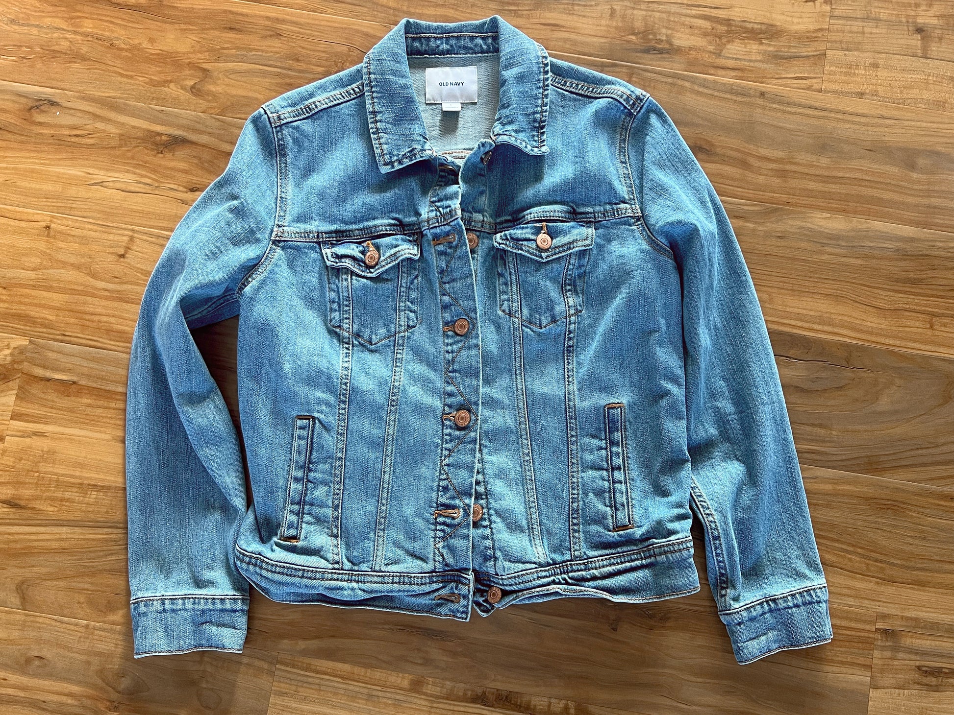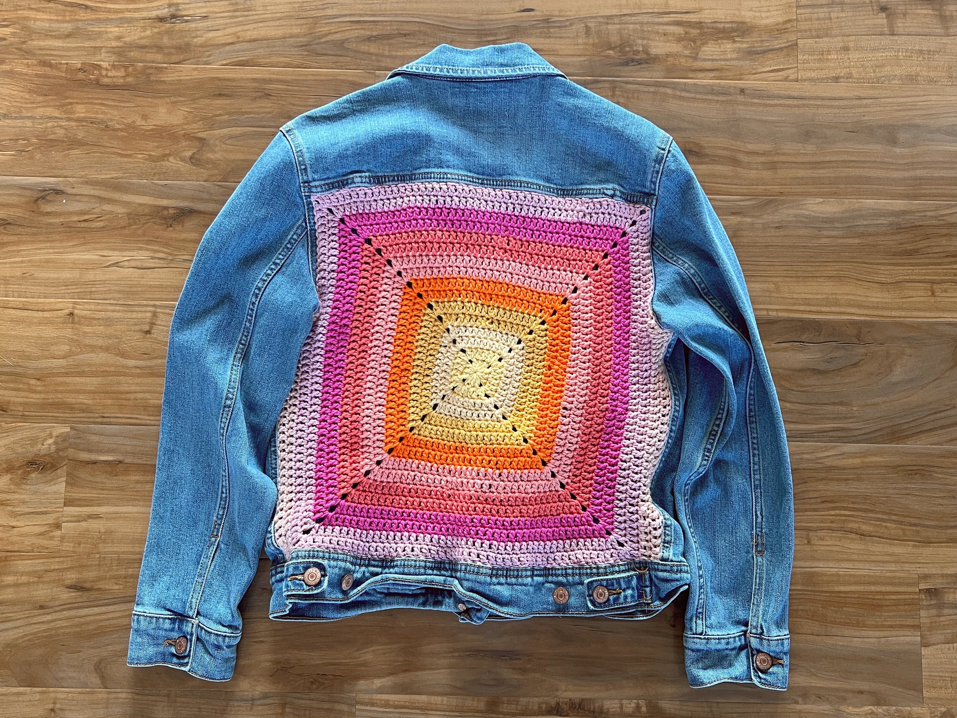 Sunshine Daydream — Up-Cycled Hand-Stitched Crochet Denim Jacket (Old Navy)